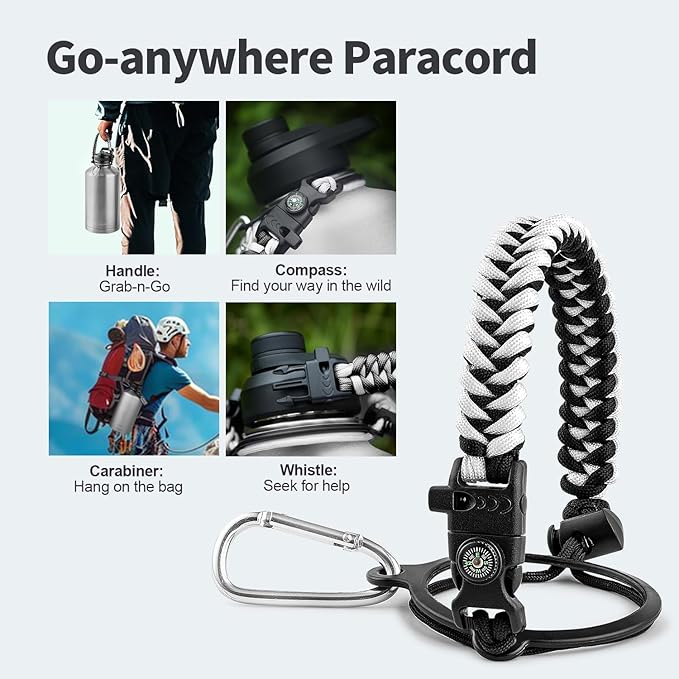 • Palm Fitting Paracord Handle: Compared to handle lids, nylon paracord on the bottle gives you more choices in terms of color coordination and coziness on your hands. Match the handle with your bottle to make a complete outdoorsy look. Compass and carabiner can be lifesavers for hiking and other expeditions