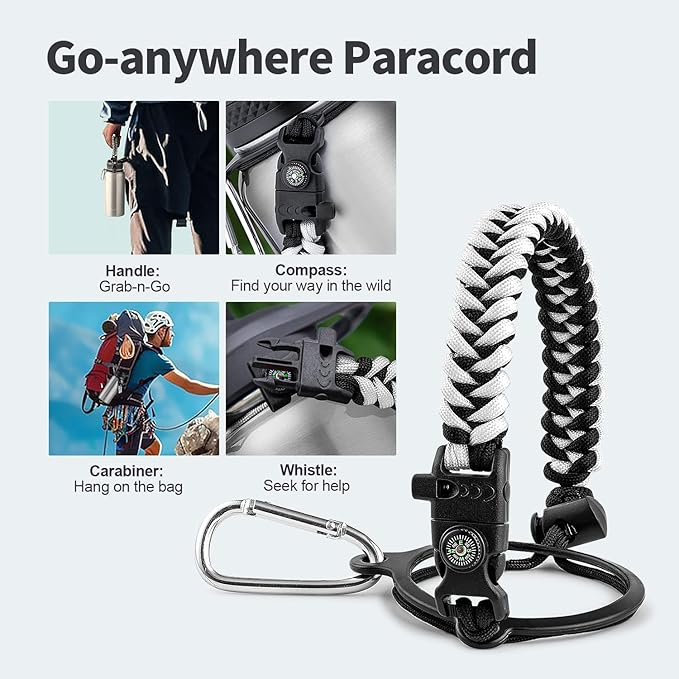 • Palm Fitting Paracord Handle: Compared to handle lids, nylon paracord on the bottle gives you more choices in terms of color coordination and coziness on your hands. Match the handle with your bottle to make a complete outdoorsy look. Compass and carabiner can be lifesavers for hiking and other expeditions