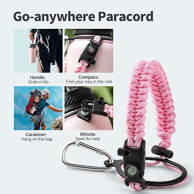• Palm Fitting Paracord Handle: Compared to handle lids, nylon paracord on the bottle gives you more choices in terms of color coordination and coziness on your hands. Match the handle with your bottle to make a complete outdoorsy look. Compass and carabiner can be lifesavers for hiking and other expeditions