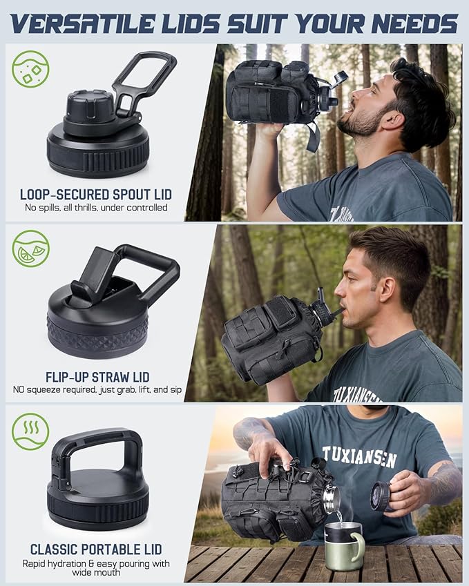 • Great Hydration System: Military water bottle set offer 2 carrying options, clipping the adjustable shoulder sling for urban commutes, or grabbing to go for portable with heavy-duty paracord handle. Ready for gym-to-wilderness transitions. A great way to keep hydrated after intense soul-stacking!