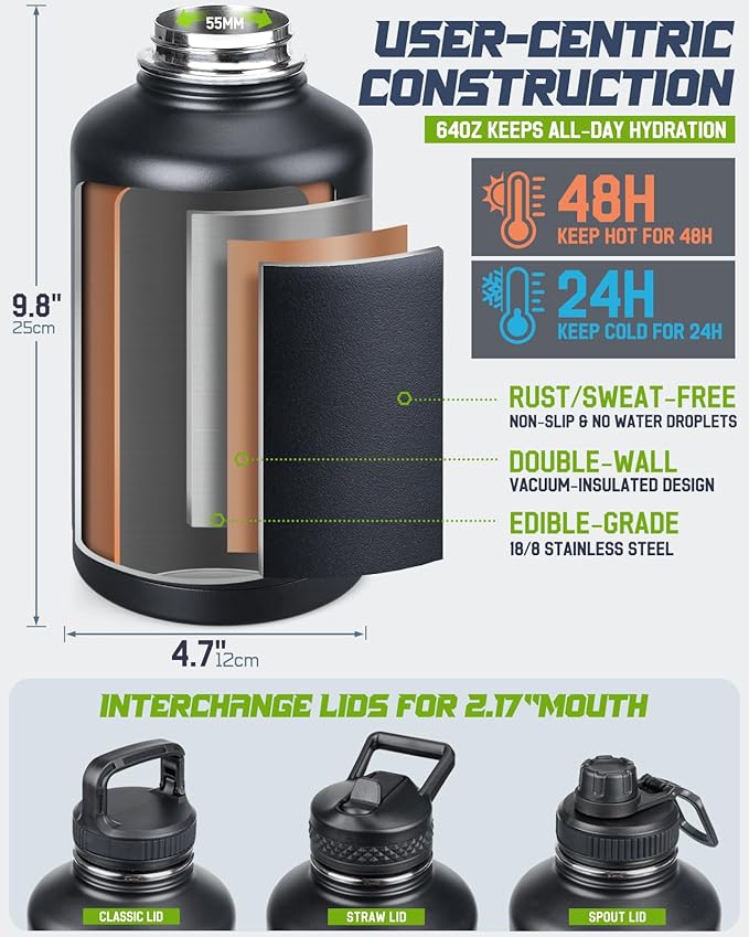 • 64oz for All-day Hydration: Half gallon water bottle ensures you stay hydrated throughout the day. bottle comes with 3 interchangeable lids for 2.28" wide mouth. Versatile lids with leak-proof design provides worry-free protection from spills, catering to various beverage needs.