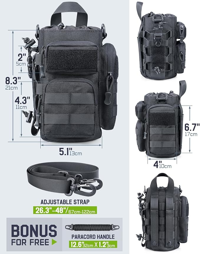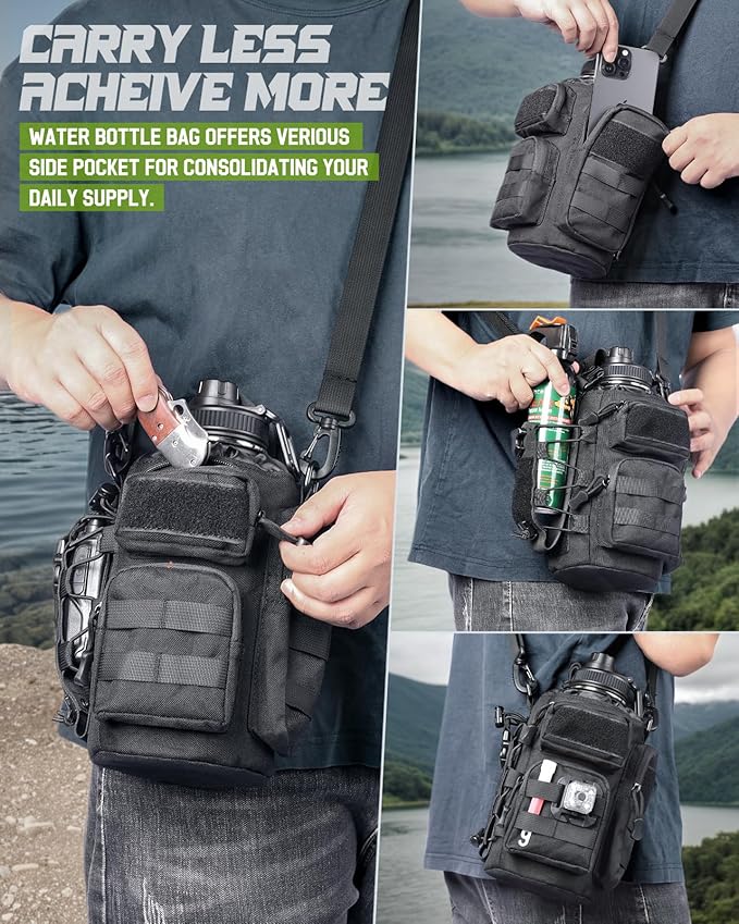 • 3-IN-1 Modular Mission Hub : Gym water bottle sleeve is made from 1000D nylon material, perfectly fitting 64oz bottle while adding lots of side pockets for storage and making your essential gears like phone/keys/walkie-talkie/earphone within reach. Swap pouches in seconds for gym/camping/EDC missions—no extra bags needed.