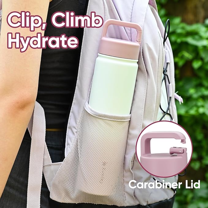 • [Clip-It Carabiner Lid]: Clip it securely to backpacks, gym bags, or belt loops—no more fumbling with loose bottles during outdoor activities. Insulated water bottle sturdy and reliable, it offers essential hands-free convenience for adventures.