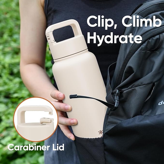 • [Clip-It Carabiner Lid]: Clip it securely to backpacks, gym bags, or belt loops—no more fumbling with loose bottles during outdoor activities. Insulated water bottle sturdy and reliable, it offers essential hands-free convenience for adventures.