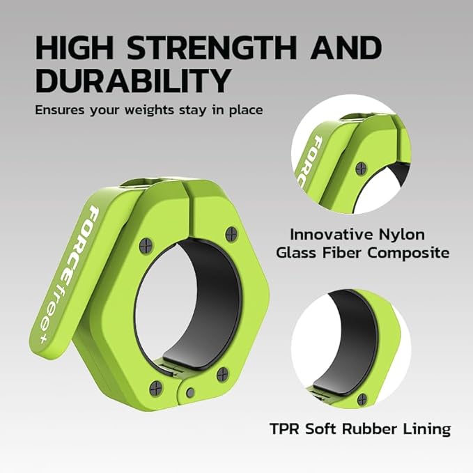 • 𝐇𝐢𝐠𝐡 𝐒𝐭𝐫𝐞𝐧𝐠𝐭𝐡 & 𝐃𝐮𝐫𝐚𝐛𝐢𝐥𝐢𝐭𝐲: Forcefree+ Barbell Clamps made of high quality innovative nylon and glass fiber composite, outperforming traditional ABS collars. This advanced material withstands heavy loads and ensures long-lasting stability and safety for your toughest workouts. Weight collars long-lasting and durable, very suitable for weightlifting, high lift, Olympic weightlifting, bench press and other strength training.