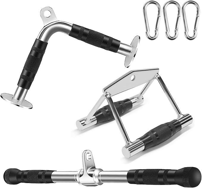 • 💪【Lat Pulldown Attachments Set】: Includes: 1x Double D Handle, 1x V-Shaped Bar, 1x Straight Rotating Bar and 3x Snap Hooks . These home gym accessories for men and women are designed to fit most cable systems.