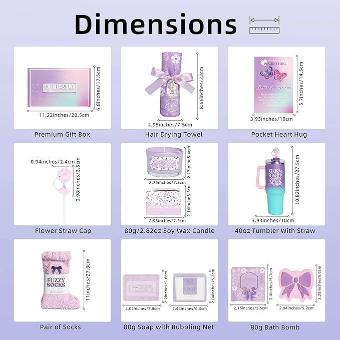 • 【9PCS Care Package for Women】:The get well gifts sympathy gift basket spa birthday gift set for women is the ultimate way to make her feel cherished. It is a luxurious and thoughtful collection, including 40oz insulated tumbler with straw, floral straw cap, 40*60cm butterfly hair-drying towel, 2.82oz juniper & lavender candle, 120g purple lavender soap, bow tie bath salt ball, bow tie fuzzy socks, pocket love card, elegant gift box. Flowers will wilt and food will be eaten, but the items in the care set will always be with her, serving as a lasting reminder that you care about her