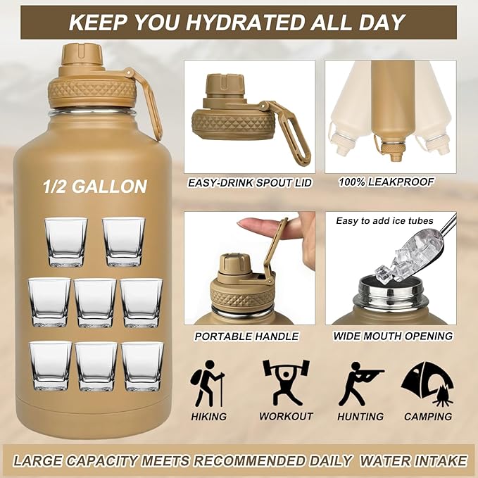 • Large Capacity Water Jug: With a whopping 64oz capacity, this stainless steel water bottle can help you drink the recommended daily amount of water, make you stay hydrated and healthy all day without constant refills. You can use the half gallon water bottle daily in home/ office or take it out when traveling or exercising out of doors.