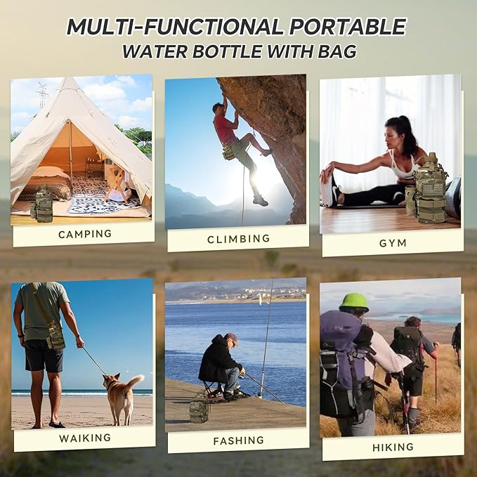 • MOLLE System Create More Carrying Space: This sport water bottle with strap features lots of MOLLE straps and webbings on the pouch for attaching accessories and gears, such as flashlight, ropes, hooks, tools, perfect for all-day tactical training, camping, fishing, walking, cycling, hiking, hunting and other outdoor activities.