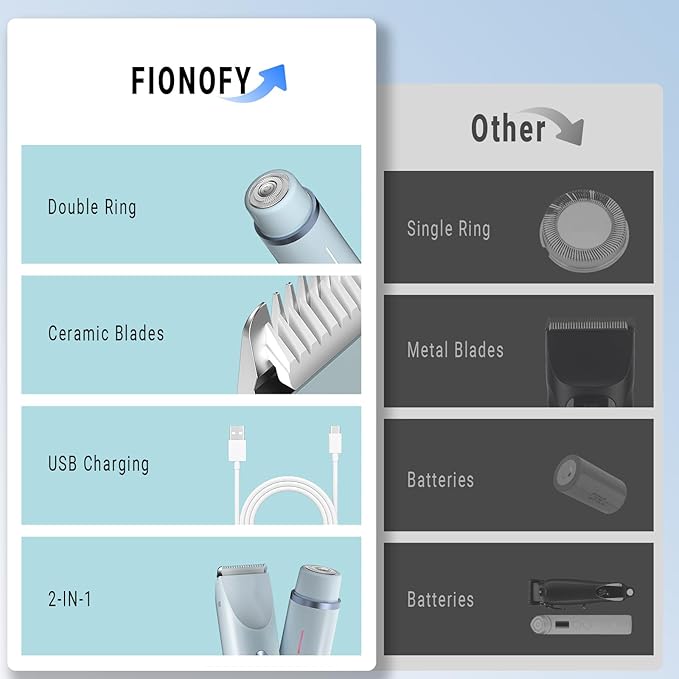 • 【2-in-1 Bikini Trimmer & Body Shaver for Women】The FIONOFY bikini trimmer for women is a versatile electric razor featuring dual professional heads. The body shaver smoothly trims arms, legs, and bikini zones, while the facial head delicately removes fuzz from cheeks, chin, and upper lips – making it the ultimate trimmer for women seeking full-body grooming.