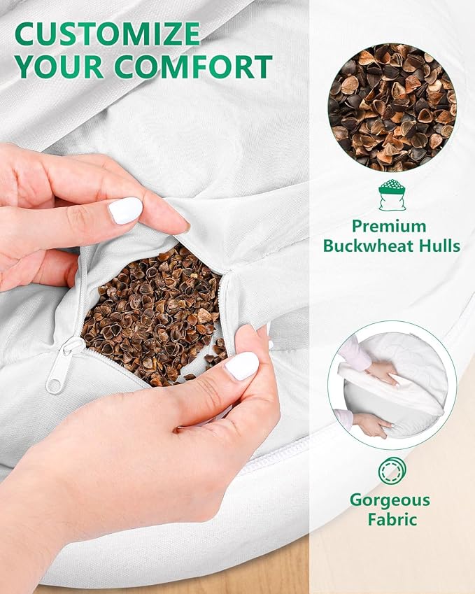 • Luxurious Cotton & Natural Buckwheat Filling: Features a soft, premium cotton cover for a plush feel and elegant look, while the natural buckwheat hull filling provides adjustable firmness and stable support for spine alignment
