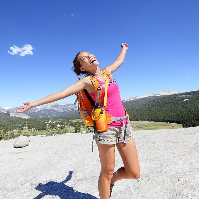 • VERSATILE AND STYLISH CARRIER BAG:The colorful water bottle carrier bag is designed to match the bottle's body, adding a touch of flair while providing practical functionality. The shoulder strap and carabiner make it easy to carry and hang, whether you're out on a hike or running errands. Plus, the small storage bag for your phone and a hook for keys make this bottle even more versatile.