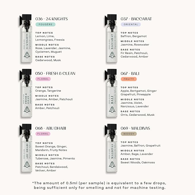 • READY TO USE + 12-SCENT SAMPLE KIT FRAGRANCES: Includes two premium fragrances—Dubai & 24 Knights—ready for immediate use in your diffuser, plus a curated 12-scent Sample Kit of our top-selling aromas. Designed exclusively for smelling, the kit helps you explore and choose your next full-size fragrance with confidence.