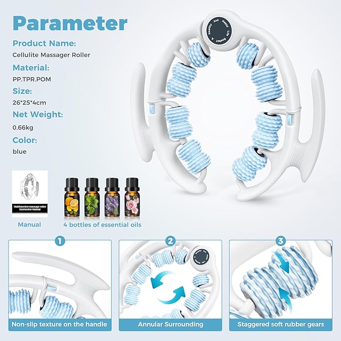 • 【Leg Roller Precautions】 If you're new to cellulite massage tool or have sensitive skin, it's recommended to apply a cream or lotion before use. Be careful to control the pressure during massage. Excessive pressure may cause bruising, but these usually subside within a few days. For optimal results, it's recommended to use cellulite roller for legs with a cream or massage oil to enhance the massage experience.