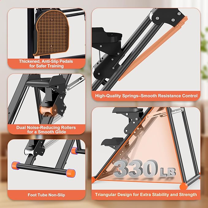• 【Sturdy Frame with Wide Pedals】:Built with premium steel and a triangular support structure, this new model vertical climber supports up to 330 lbs while staying stable through high-intensity sessions. Non-slip foot pedals and an ergonomic handlebar provide added safety and balance, ensuring a secure, comfortable workout every time.