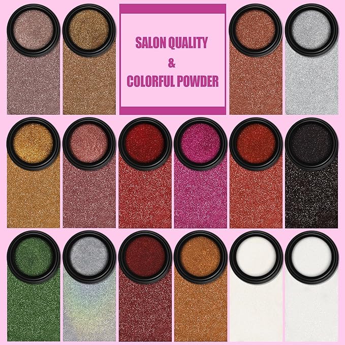 • PACKAGE CONTAINS: 16 pcs(each 1gram) Artdone Chrome Nail Powder, 2 for white based chrome nail mirror pigment powders, 14 for colored mirror chrome powder. They needs to be used with gel nail polish and no wipe top coat