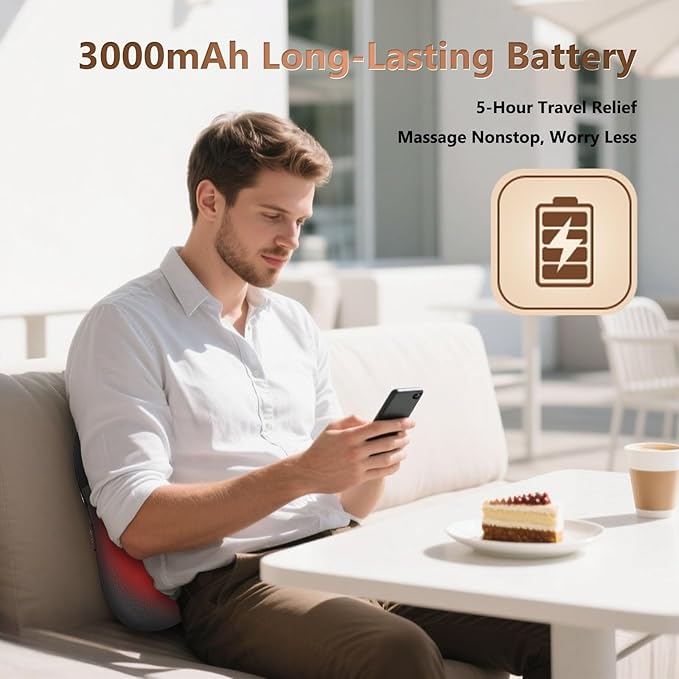• 【Cordless and Large Capacity 】This back massager with heat features a wireless design with a robust 3000mAh battery, delivering ultimate convenience and freedom of movement. No more tangled cords or anxiety about short usage times - easily bring this shoulder and back massager anywhere. Whether you're recovering from workouts or managing chronic discomfort, it therapeutic kneading and heat therapy provide effective relief for a rejuvenated body.