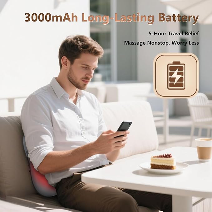 • 【Cordless and Large Capacity 】This back massager with heat features a wireless design with a robust 3000mAh battery, delivering ultimate convenience and freedom of movement. No more tangled cords or anxiety about short usage times - easily bring this shoulder and back massager anywhere. Whether you're recovering from workouts or managing chronic discomfort, it therapeutic kneading and heat therapy provide effective relief for a rejuvenated body.
