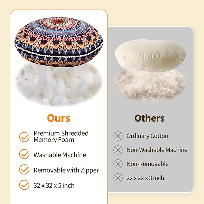 • Giant Floor Pillow: LOVMOC floor cushion is 32 inches in diameter, large enough for adults to sitting with crossed legs to meditate