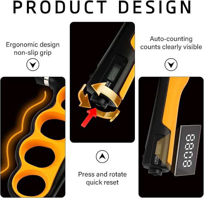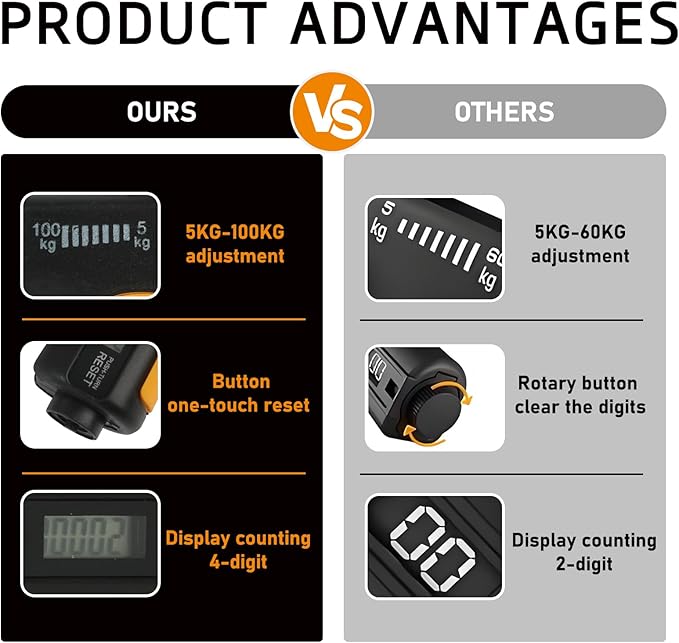 • Adjustable resistance: The adjustable resistance range is 5 to 100KG, suitable for all hand strength training needs. Easy to adjust, suitable for both beginners and experienced fitness enthusiasts. Moreover, this grip strength trainer is equipped with an intelligent counter that can automatically record exercise data. It can be easily reset simply by rotating the button