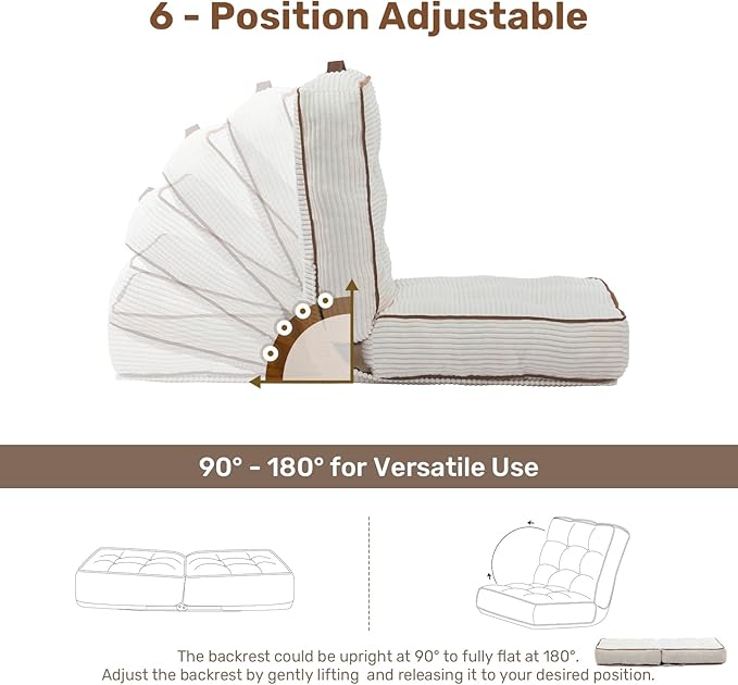 • 【6 Adjustable Positions】 The backrest of this adjustable floor chair offers 6 levels from upright to flat, making it ideal as a gaming floor chair, meditation chair, or reading lounger for dorm or bedroom