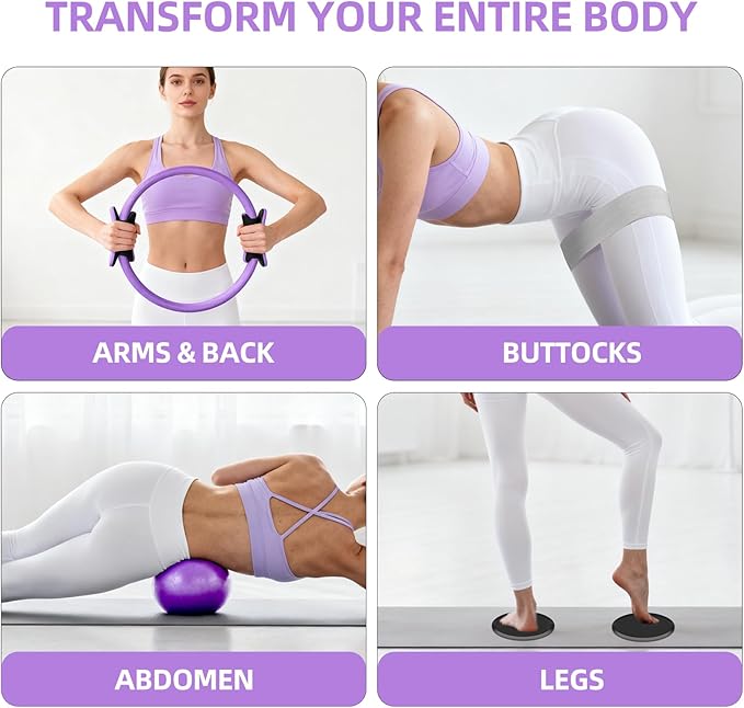 • Strengthen Core & Improve Balance: The pilates ring targets arms, thighs, and abs, while the sliding discs and mini ball engage stabilizing muscles to improve core strength, posture, and flexibility with low-impact training.