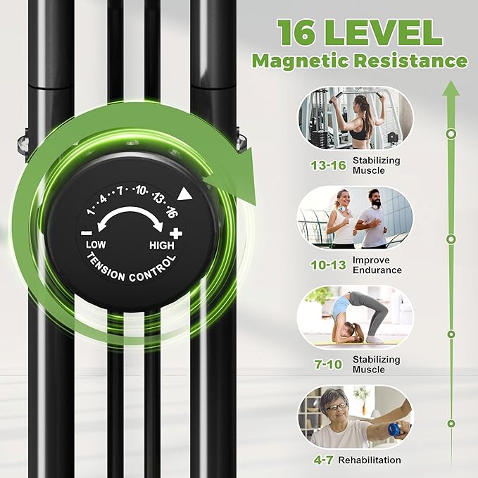 • Quiet & Sturdy: The magnetic resistance keeps fitness bicycles very quiet during cycling, with 16 level gear adjustment to meet your different riding needs. The sturdy heavy-duty steel frame and X-shaped structure provide you with a stable fitness bike, with a support capacity limited to 330 pounds.