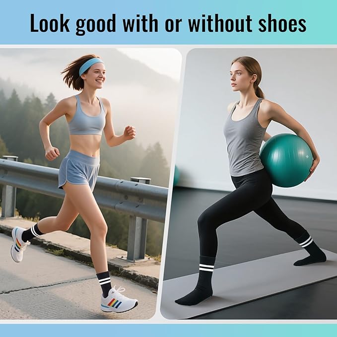 • [WOMEN ATHLETIC SOCKS]: Designed to look great whether worn with shoes, or barefoot, these grip socks seamlessly transition from indoor workouts (yoga, Pilates, weightlifting) to outdoor activities. Their sleek design and functional grip make them the perfect all-in-one choice for fitness and casual comfort.