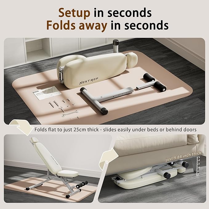 • 【Zero Compromise Bench: Pro-Grade Stability Meets Home Training】 Perfect for apartment workouts! This space-saving bench folds to just 33.86" x 15.75" x 9.84" (slimmer than carry-on luggage), freeing 85% of floor space. Assembles in 5 minutes – easier than toy blocks. Features one-hand pull-pin adjustments and integrated locking pins for hassle-free storage. Turn any small space into a pro gym instantly
