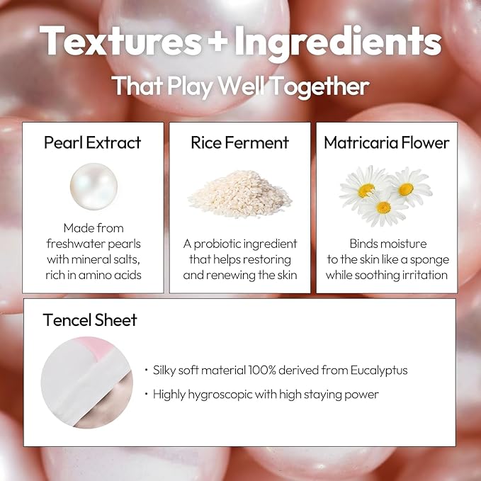 • CLEAR SKIN - Our Pearl mask, a tencel sheet mask with Pearl extract, contains anti-aging benefits to promote rejuvenation and help your skin emulate the soft, classic beauty of the gemstone.