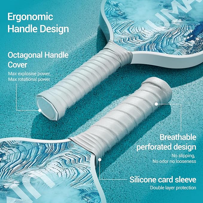 • Comfortable Ergonomic Grip: The pickleball racket handle is designed to be perforated, sweat absorbent, and cushioned. It can help users better grasp the grip and provide cushioning. 4.92" grip circumference allows enough room for maximum wrist snap for power and spin and range of motion in your wrist. The breathable grip is sweat-absorbent and anti-slip that makes you say goodbye to troubles like slippery hands, odor, and loose grip, concentratng on enjoying the pleasure of competition