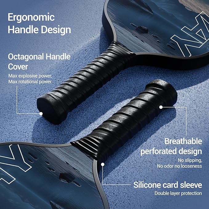 • Comfortable Ergonomic Grip: The pickleball racket handle is designed to be perforated, sweat absorbent, and cushioned. It can help users better grasp the grip and provide cushioning. 4.92" grip circumference allows enough room for maximum wrist snap for power and spin and range of motion in your wrist. The breathable grip is sweat-absorbent and anti-slip that makes you say goodbye to troubles like slippery hands, odor, and loose grip, concentratng on enjoying the pleasure of competition