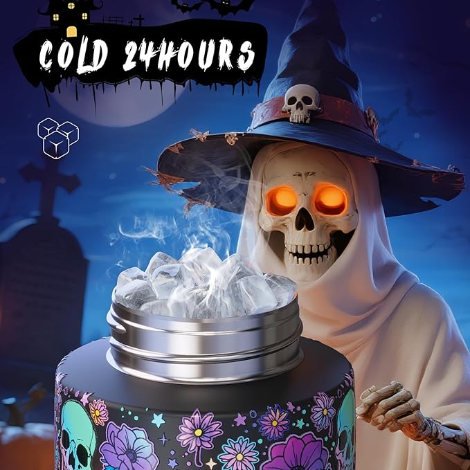 • Keeps Cold 24H: 24: Crafted with double-wall vacuum stainless steel to resist dents and rust, this insulated water bottle keeps drinks cold for 24 hours and hot for 8 hours – perfect for ghostly gatherings and costume parties