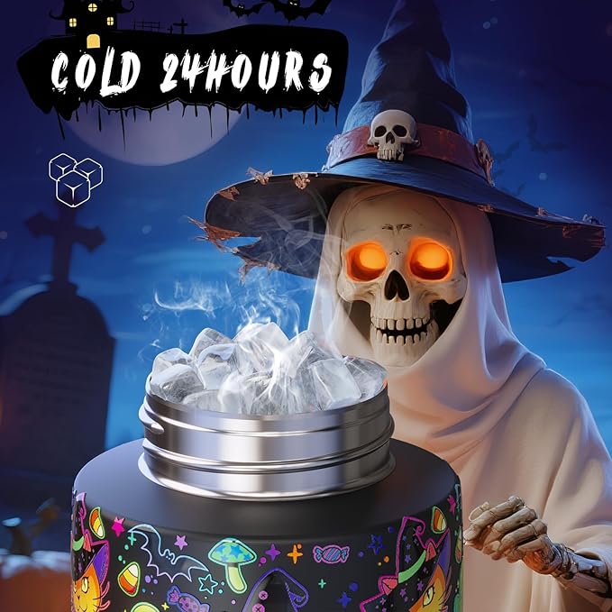 • Keeps Cold 24H: 24: Crafted with double-wall vacuum stainless steel to resist dents and rust, this insulated water bottle keeps drinks cold for 24 hours and hot for 8 hours – perfect for ghostly gatherings and costume parties