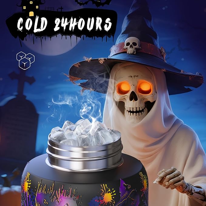 • Keeps Cold 24H: 24: Crafted with double-wall vacuum stainless steel to resist dents and rust, this insulated water bottle keeps drinks cold for 24 hours and hot for 8 hours – perfect for ghostly gatherings and costume parties