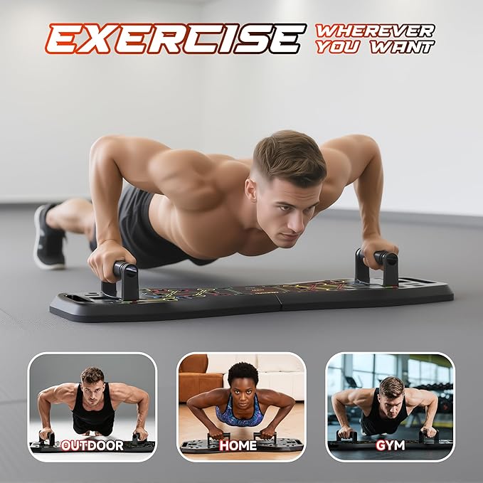 • MULTIFUNCTIONAL PUSH UP BOARD FOR TARGETED TRAINING Achieve precise muscle engagement with our smartly designed push up board. Color-coded hand placement guides ensure you effectively isolate and work your chest, triceps, shoulders, back, and core during various push-up variations, reducing the risk of strain and improper form. The non-slip base provides unwavering stability on any floor surface