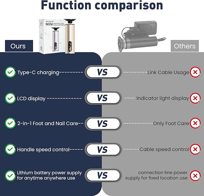 • [Rechargeable wireless electric callus remover for feet]:Unlike traditional wired electric foot callus removers, our foot callus remover is designed wirelessly, providing convenience for movement and eliminating the hassle of wires. The heel file of cracked high heels is powered by a rechargeable 1000mAh battery, supporting up to 5 hours of use. It comes with a Type-C USB charging port, making charging more convenient and faster.