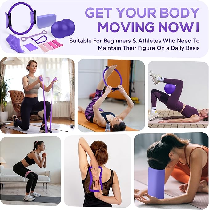 • 【Pilates 13-Pcs set】This professional Pilates Ring Essentials Kit for Women includes Pilates ring,2 Pilates ball,Yoga Block,8-shaped resistance band,yoga stretch ring and other accessories.The rich accessories provide full-body training needs,helping you easily perform strength, flexibility and body shaping exercises,and improve exercise efficiency