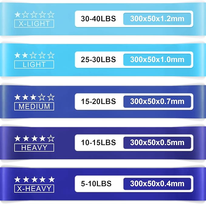 • 5 Level Resistance Band Set:The 5 different colors of the exercise bands different resistance levels and have been optimized and upgraded to increase their thickness compared to the more common resistance bands for legs, with weights ranging from 10lbs to 115lbs when used in combination. Whether you are a beginner or an experienced fitness enthusiast, we have the right weight level for you, which will make this set of fitness band resistance bands your ideal workout companion.