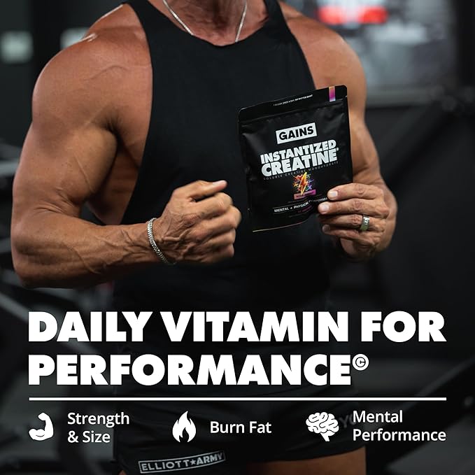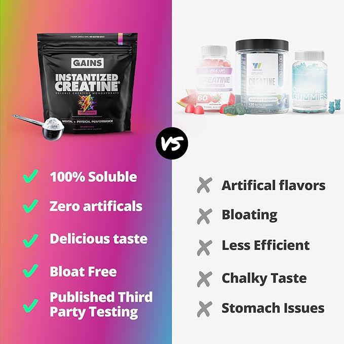 • INSTANTIZED CREATINE: Gains in Bulk Instantized Creatine is a 100% soluble creatine monohydrate powder, delivering all the benefits of creatine without the bloating, water retention, or gritty texture. Backed by research, it helps enhance muscle endurance, strength, and size for peak performance.