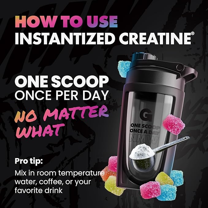 • HOW TO TAKE: Take one 5g serving of creatine monohydrate using the included pre-measured scoop, everyday, no matter what, for ideal results. For every 5g serving use 16 oz of room temperature water and gently stir or shake for 30-60 seconds until completely dissolved and clear. Also mixes great in any pre workout or post workout shake.