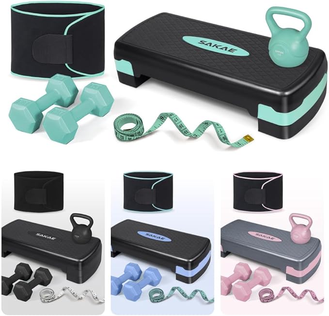 SAKAE Adjustable Aerobic Stepper Kit with Dumbbells & Kettlebell & Weightlifting Belt & Measuring Tape, 2 Level Risers Exercise Step Platform for Home Gym Exercise Fitness Workout, Multiple Colors