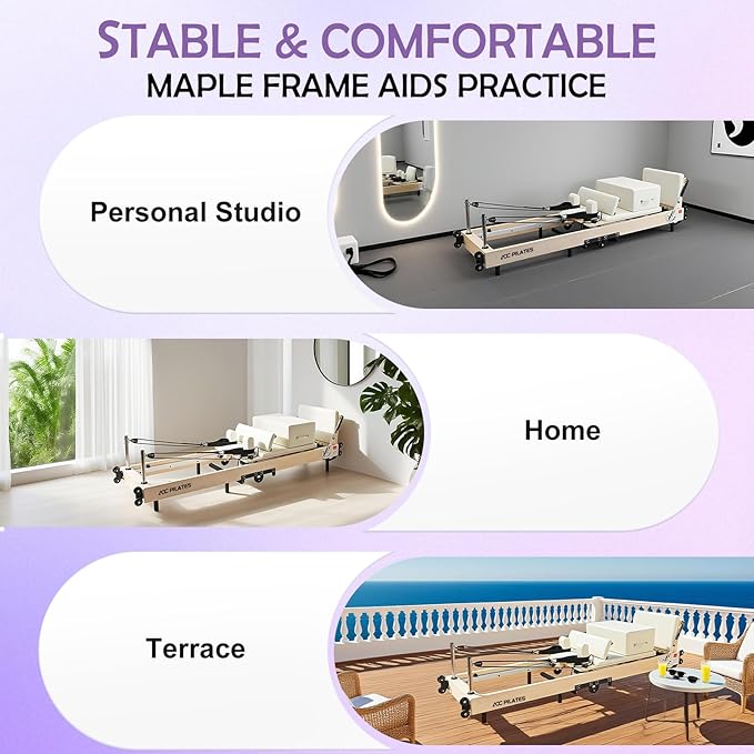 • CONFIGURATION & DESIGN: Pilates reformer machine has maple main structure with adjustable headrest and body-type suitable shoulder pads. Aluminum-reinforced for 660lbs capacity, suitable for individual or shared use. Height-adjustable aluminum legs boost floor stability; foldable design (0.38 sq m) with 8 polyurethane wheels for smooth movement, suit small spaces