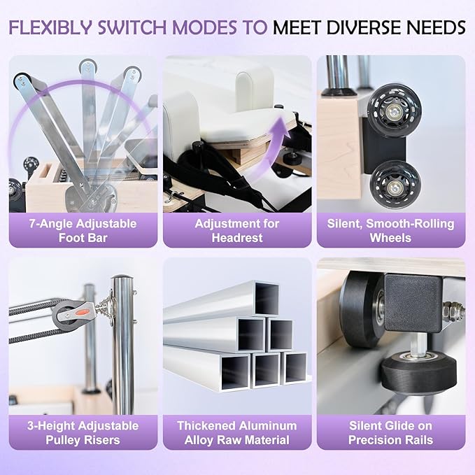 • PROFESSIONAL PERFORMANCE: Pilates reformer set features 6 sturdy springs (12 tensions), 7-position adjustable foot bar, 3-height pulley riser. Dual-adjustable headrest ensures precise alignment, suiting all user levels. 6 heavy-duty cords (23.76/36.96/72.38lb options) for targeted strength training