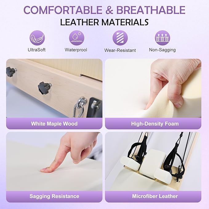 • COMFORT & EASY CLEANING: AOC PILATES Wooden foldable pilates reformer has high-density foam seat/backrest wrapped in soft, durable microfiber leather for long-workout comfort. Easy-to-clean material stays fresh with daily heavy use