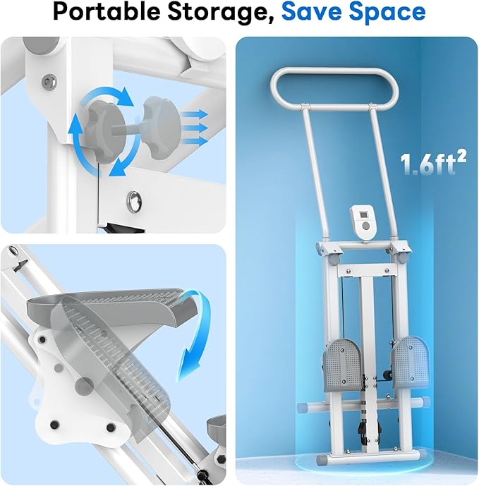 • Perfect for small apartments and spaces: The ERGOLIFE stair stepper with resistance for home folds in just one step, taking up only 1.6 sq ft. It can be slid under a bed or placed in a corner for storage, allowing you to exercise freely in a small apartment.