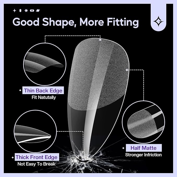 • No File Needed & Strong Adhesion:Upgraded almond Nails feature a half matte and pre-etched surface, requiring no filing for maximum adhesion. This easy to apply design saves time and provides a strong grip, ensuring your full cover nail tips stay secure for daily tasks like typing and housework.