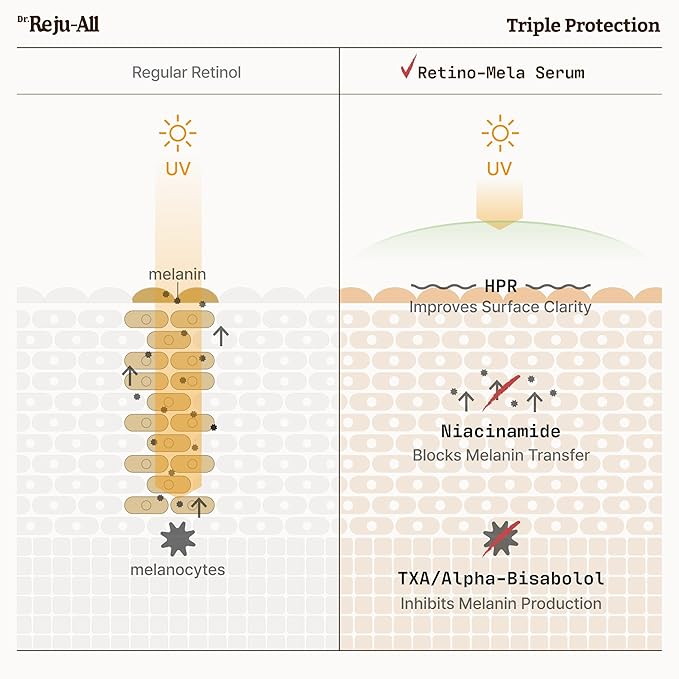 • MELANIN TRIPLE CARE: BLOCKS, PREVENTS, CLEARS — With HPR, Niacinamide, TXA, and Alpha-Bisabolol, this advanced tone-care system helps block melanin, control uneven tone, and target the appearance of spots for a clearer, more even-looking complexion.