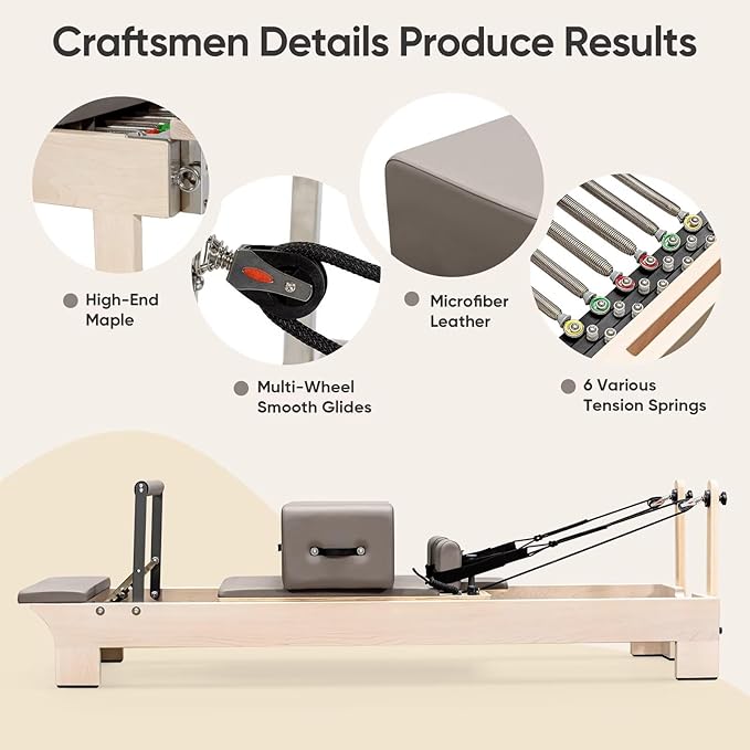 • 【Premium Maple Wood Frame for Professional Use】This deluxe Pilates Reformer is crafted from high-quality maple wood, offering superior durability and elegance for professional-grade training. Built for long-term use, the frame combines luxury aesthetics with uncompromising strength, making it suitable for advanced users, instructors, or anyone who demands more from their home workouts.