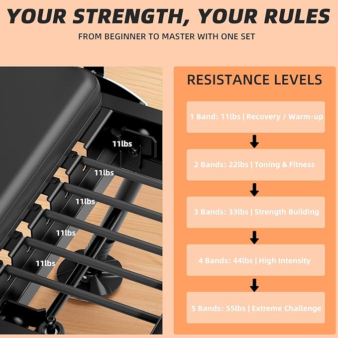 • 【Professional 78-Inch Smooth & Silent Glide】Experience the flawless, fluid movement of a professional studio reformer. The full 78-inch track length is engineered for unrestricted movement and is ideally suited for users up to 5'8" (172cm) in height. High-quality stainless steel ball bearings and silent nylon pulleys ensure a whisper-quiet, buttery-smooth glide for undisturbed, immersive workouts.
